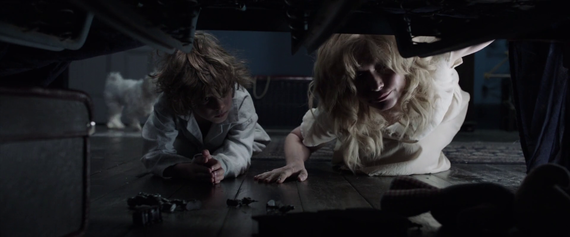 Na relação de Amelia e de Samuel com o luto e com o fantasma que, nesse momento, permanece monstruoso, a tela da televisão desempenha um papel importante nos jogos de espelhos. Como um espelho metafórico, a tela da televisão duplica menos as figuras das personagens do que seus estados psicológicos, suas paisagens mentais. Nesse sentido, o efeito da mudança constante de canal, por meio do controle remoto, aprofunda a desorientação subjetiva de Amelia, enquanto o refúgio imaginário de Samuel junto a um mágico (cuja fala de apresentação, sobre como a vida pode ser maravilhosa, mas também traiçoeira, o garoto reproduz ao brincar) reitera a postura combativa que ele expressa diante do monstro, em mais de um momento, e ao usar as engenhocas que inventa como armas.